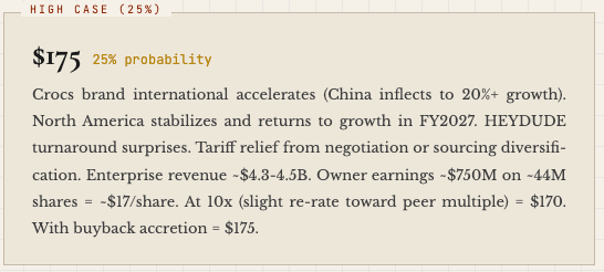 3. Brand fatigue. The existential risk that Crocs “goes away” culturally. This has been the bear thesis since 2008. Eighteen years later, the brand is stronger than it has ever been, generating $3+ billion in annual revenue. Probability: Very Low.