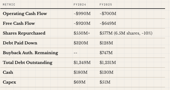 Net debt of ~$1.1 billion ($1.23B debt minus $130M cash) against ~$700M operating cash flow puts net leverage at roughly 1.6x EBITDA. Management targets 1.0-1.5x and is actively deleveraging. The maturity schedule is manageable. No near-term refinancing risk. Balance sheet is not a concern.