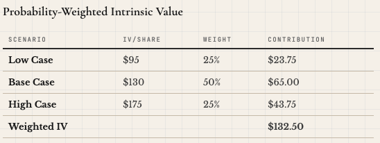 At $79.54, the stock trades at a 40% discount to probability-weighted intrinsic value. Even the low case ($95) offers 19% upside from the current price. The margin of safety is not in the assumptions. It is in the price.