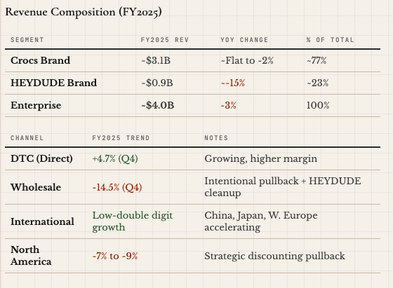 The business is simple enough to explain in three sentences: Crocs makes injection-molded foam footwear (primarily clogs) under its namesake brand and casual canvas shoes under HEYDUDE. The simplicity is the point. The Crocs brand generates roughly 75% of enterprise revenue and is the engine of the business. HEYDUDE, acquired for $2.5 billion in 2022, generates the remaining ~25% and is the source of essentially all controversy surrounding this stock.