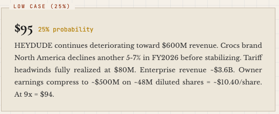 The question is whether the market is right. Is this a business in structural decline, or is this a business experiencing a temporary revenue reset driven by deliberate wholesale pullback, HEYDUDE restructuring, and tariff headwinds, all of which are transient?