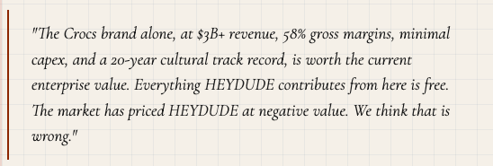 The consensus view on Crocs is that it is a “fad brand” without a durable competitive advantage. This is the same thing people said in 2018 at $10, in 2020 at $20, and in 2022 at $60. The stock is up 700%+ from its 2018 lows. At some point, a “fad” that persists for two decades and generates $4 billion in revenue becomes something else.